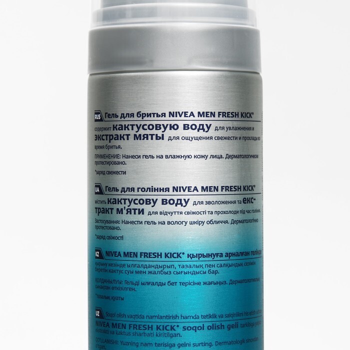 Описание: не хватает свежести? Попробуй новую линейку средств для и после бритья "NIVEA MEN Fresh Kick" с мятой и кактусовой водой! В составе геля для бритья экстракт мяты обеспечивает приятное ощущение прохлады и свежести на коже без раздражения, а кактусовая вода увлажняет кожу, предотвращая сухость и шелушение. Будь естественно свеж вместе с "NIVEA MEN Fresh Kick"!