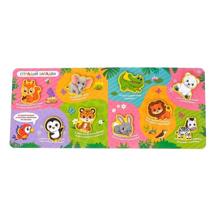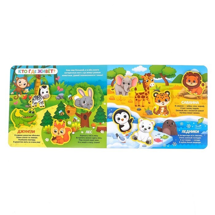Ваш малыш обожает животных? Тогда эта яркая книга точно понравится крохе. Играя с липучками, ребёнок узнает, где обитают разные виды зверушек, и весело проведёт время.