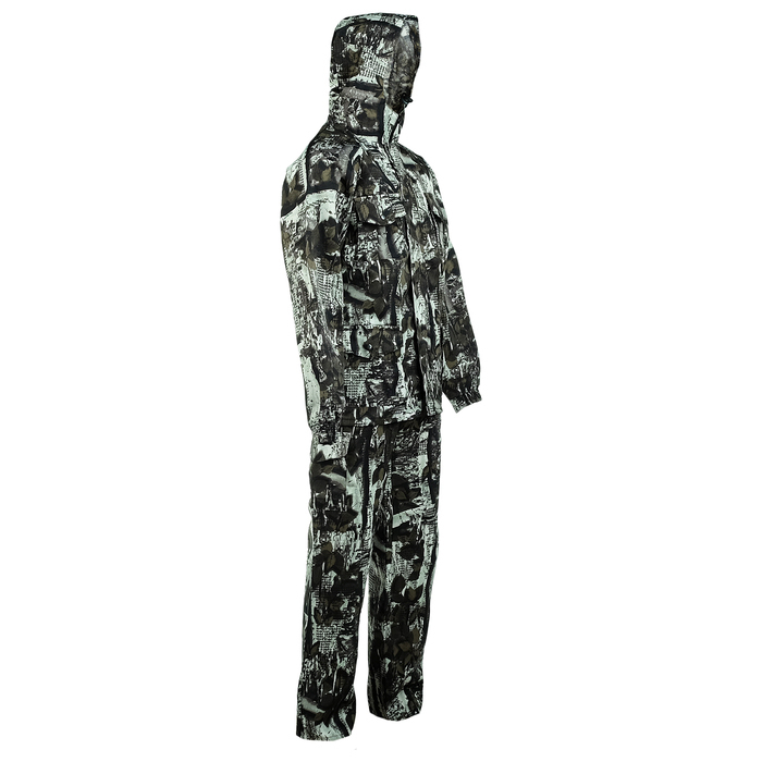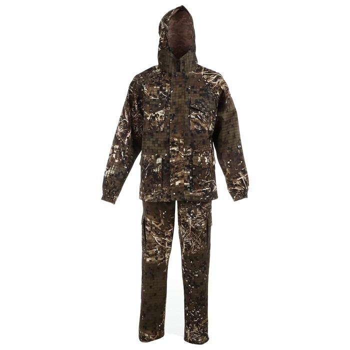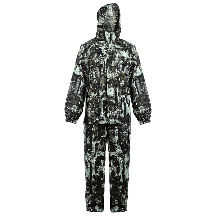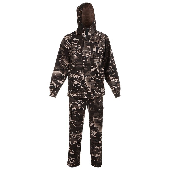 Костюм состоит из прямой удлинённой куртки с капюшоном и брюк.