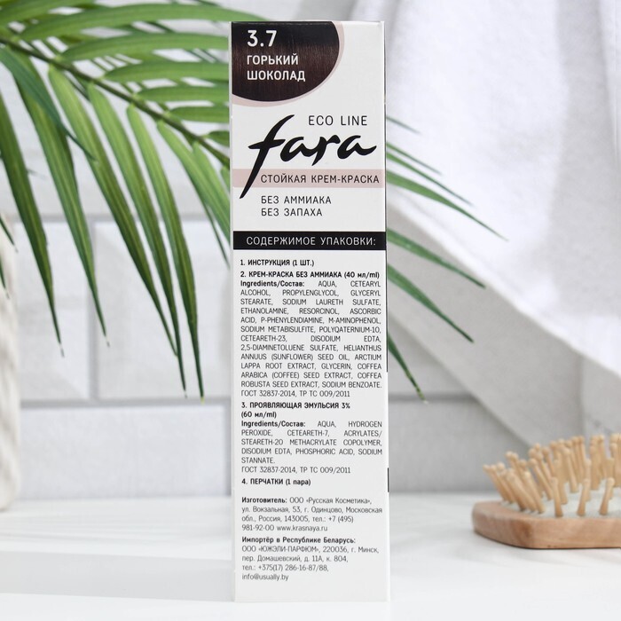Fara Eco Line — стойкая крем-краска без аммиака и без запаха со 100% натуральным репейным маслом обеспечивает стойкий эффект окрашивания, яркий насыщенный цвет, щадящее воздействие и бережный уход за волосами от самой природы. Специально подобранный для оттенка 3.7 дополнительный активный компонент — натуральный экстракт кофе питает, укрепляет и регенерирует волосы, защищает от ультрафиолетового излучения, а также придает волосам свежесть и сияние.