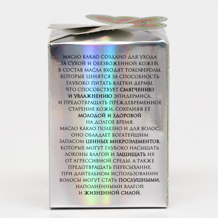 Нерафинированное масло какао — полезный продукт, в основе которого жирные кислоты: стеариновая, олеиновая, пальмитиновая и линолевая. Также в состав входит большое количество танинов, кофеина и ксантина. Эти вещества благотворно влияют на состояние кожи.