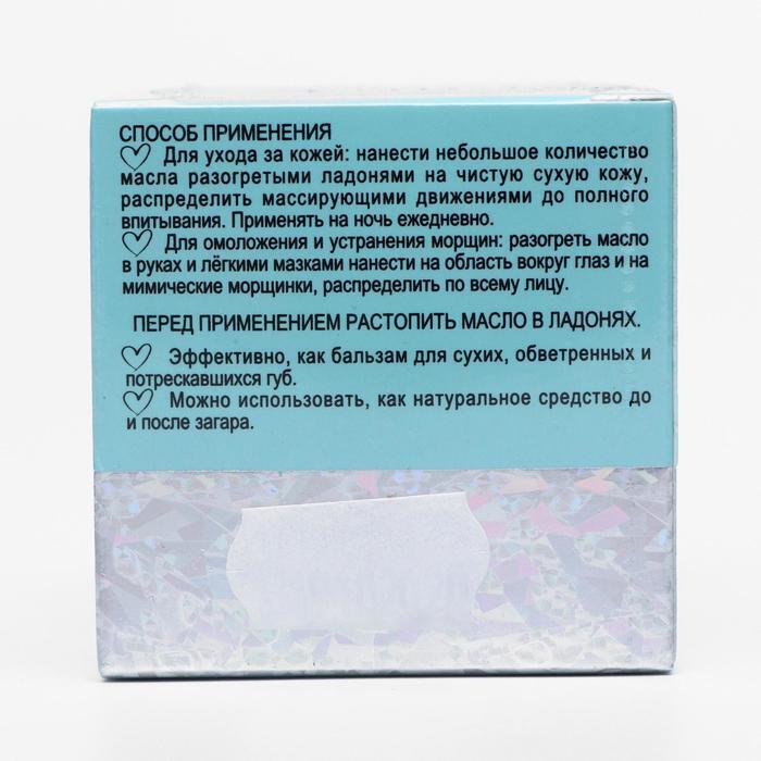 Для ухода за кожей лица и тела: нанести небольшое количество масла ши разогретыми ладонями на чистую сухую кожу, распределить массирующими движениями до полного впитывания. Применять на ночь ежедневно.