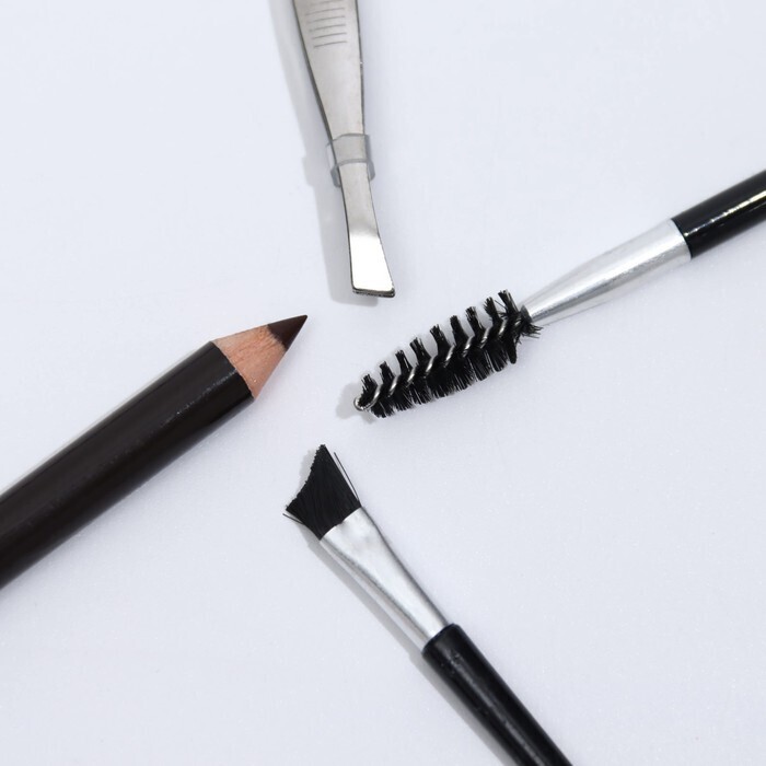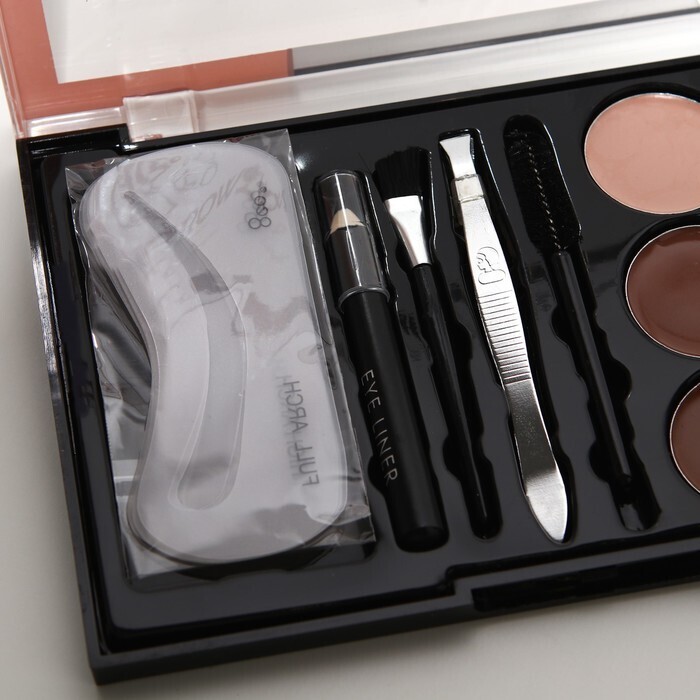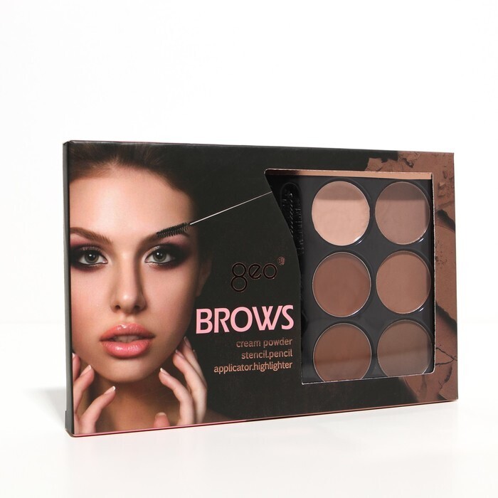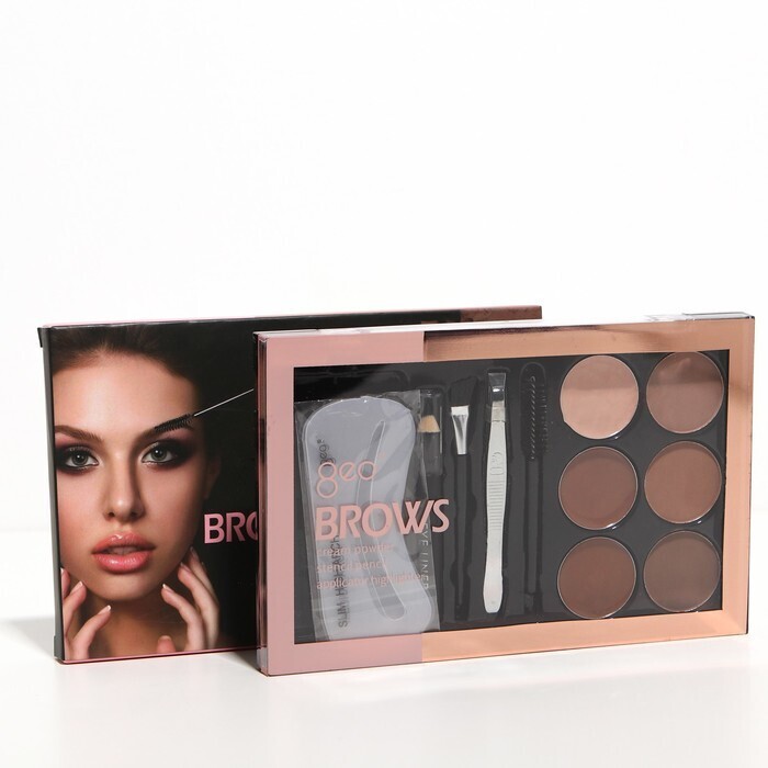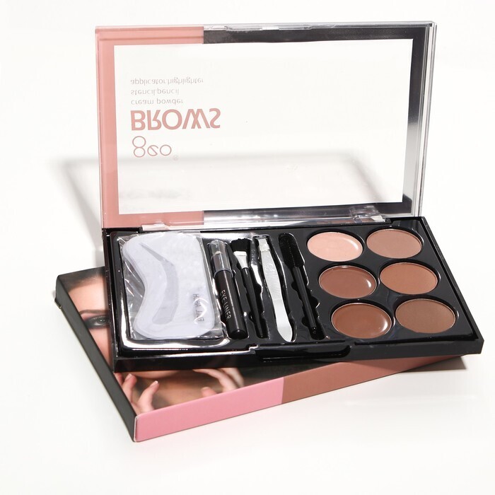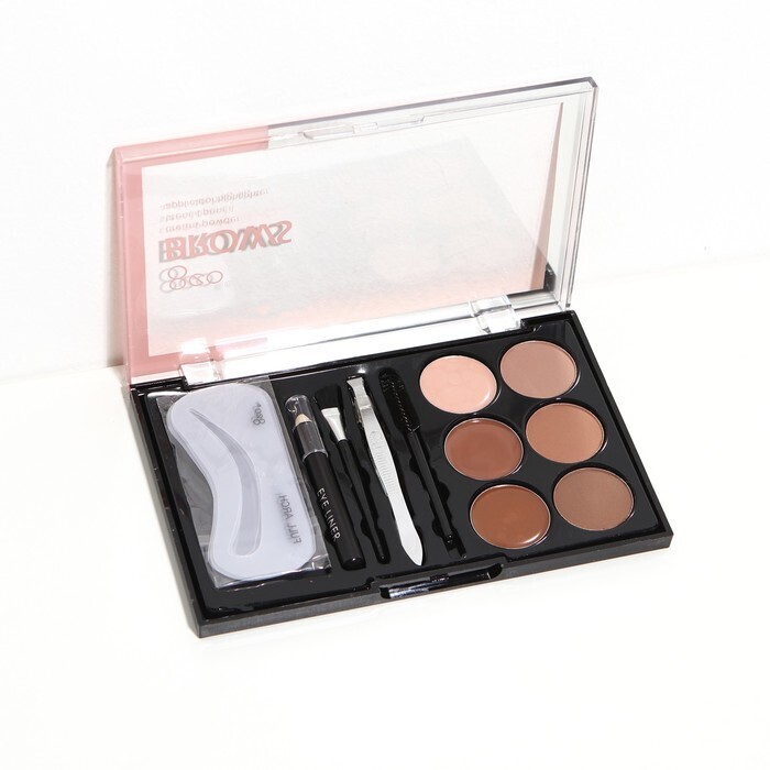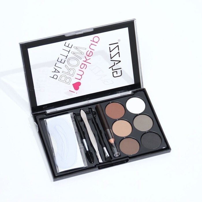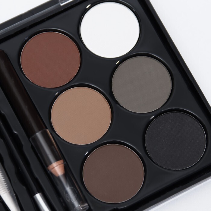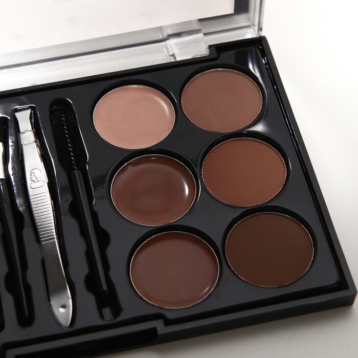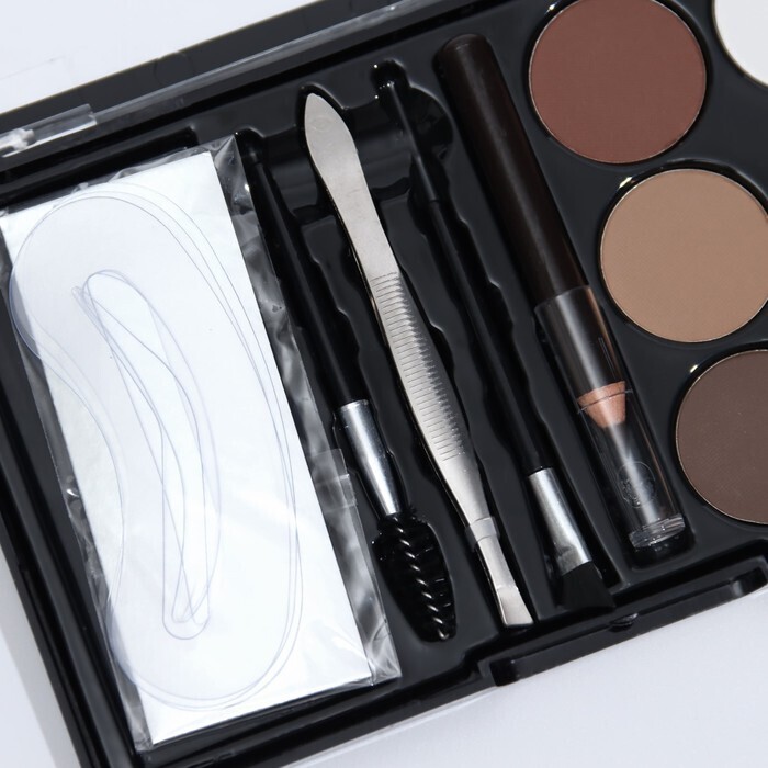 Идеальный набор для макияжа бровей, 6 оттенков теней для нанесения как на сами брови, так и на веки, пинцет для коррекции бровей, специальная кисть для заполнения межволоскового пространства, щёточка для бровей, карандаш для бровей и трафарет для создания идеально симметричных форм.