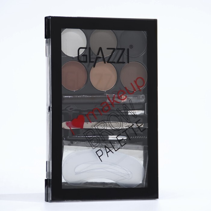 Состав набора: 6 оттенков теней, пинцет, кисть, щётка, карандаш, трафарет.
