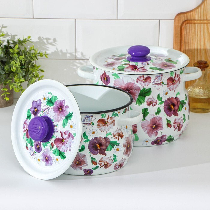 Кастрюли сделаны из качественной стали, покрытой эмалью с декоративным рисунком. Они отлично подходят для приготовления и хранения различных блюд.