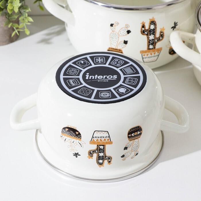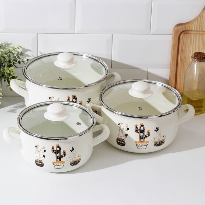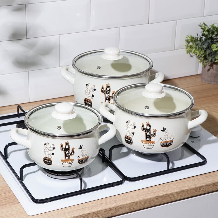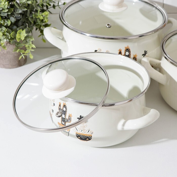 Набор кастрюль «Белые кактусы», 3 предмета: 2,1 л, 3,1 л, 4 л, индукция, цвет белый