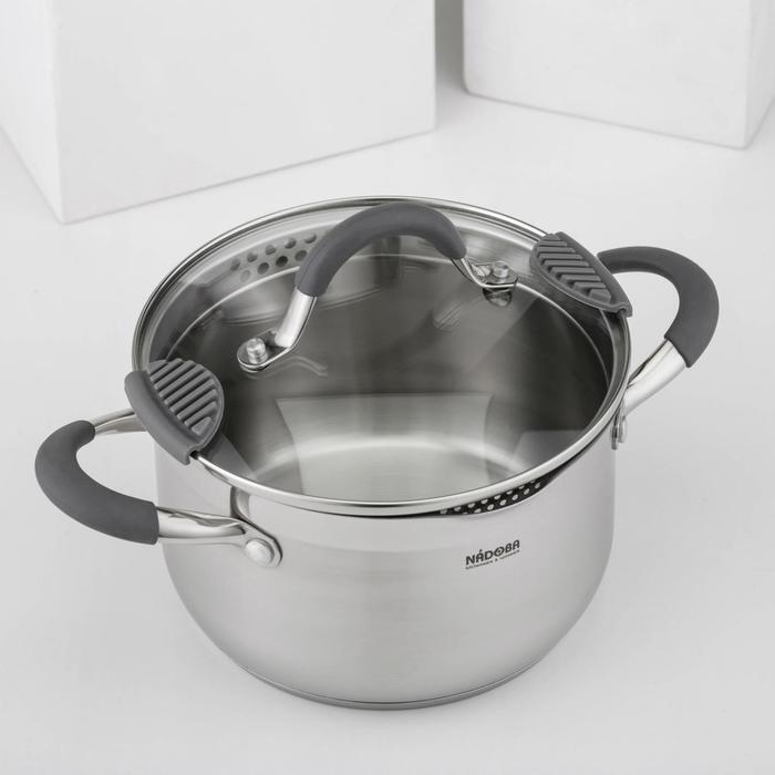 • Встроенный в крышку дуршлаг, носики на корпусе посуды, теплозащитные силиконовые держатели на крышке — помогают придерживать её во время слива воды, не обжигают руки.