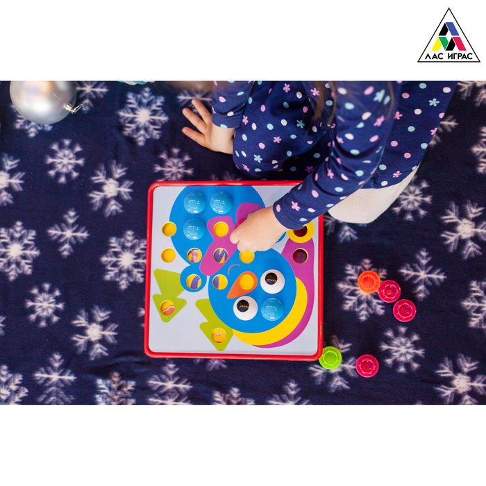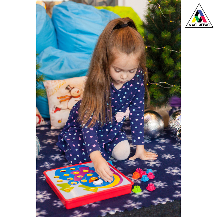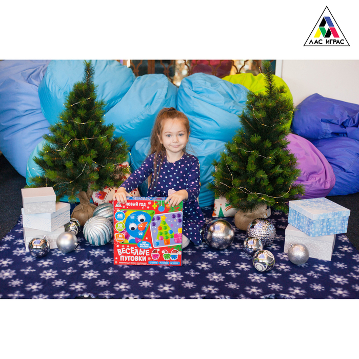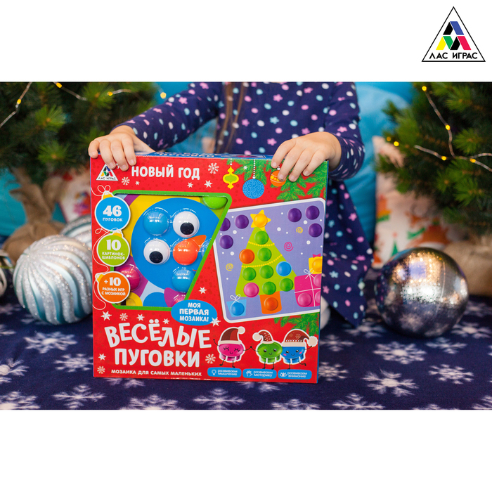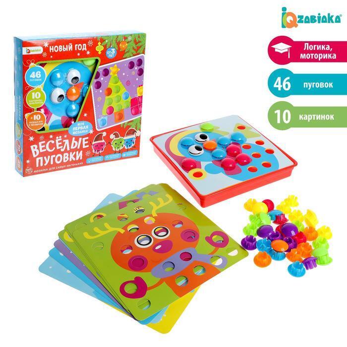 Это новогодняя версия полюбившейся всем игры-мозаики «Весёлые пуговки». Крупные яркие детали и 10 разноцветных новогодних картинок не оставят равнодушным никого. Развивайте мышление, внимание и моторику!