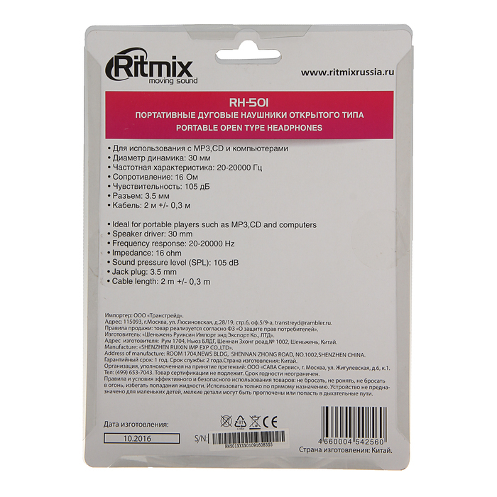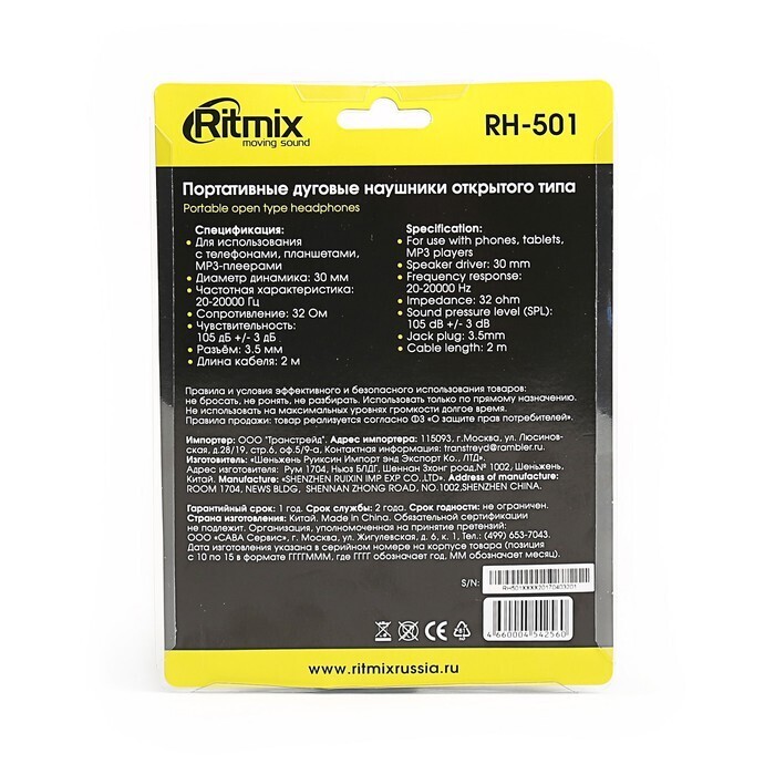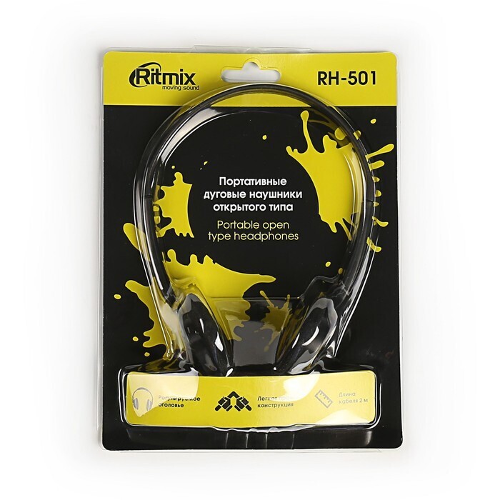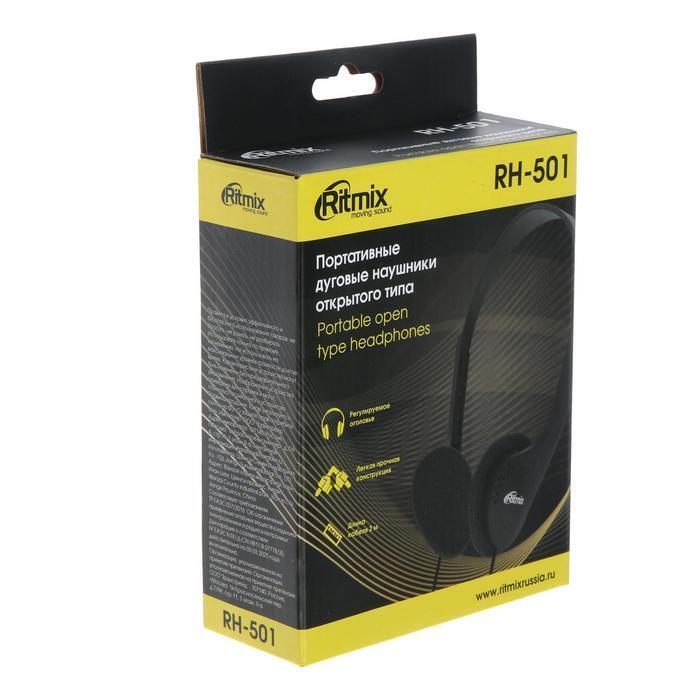 Наушники Ritmix RH-501, накладные, 105 дБ, 16 Ом, 3.5 мм, 2 м, черные
