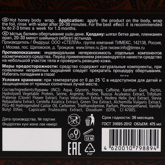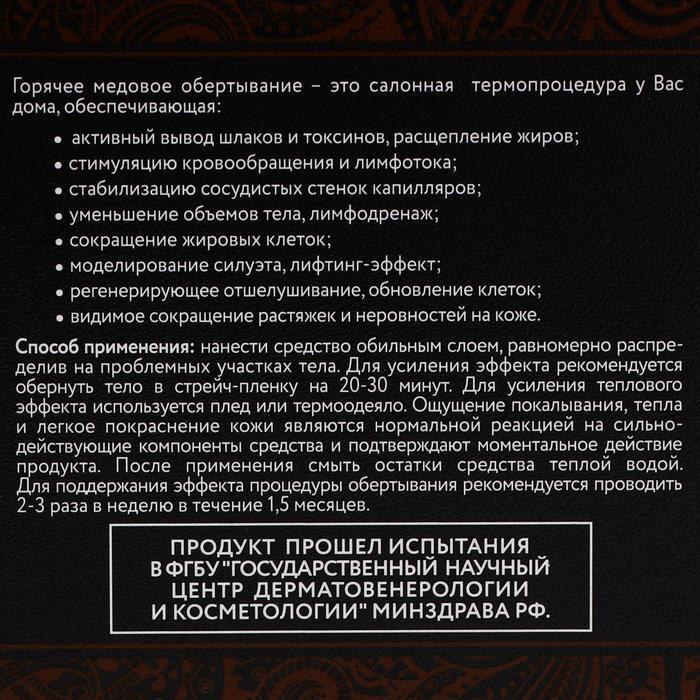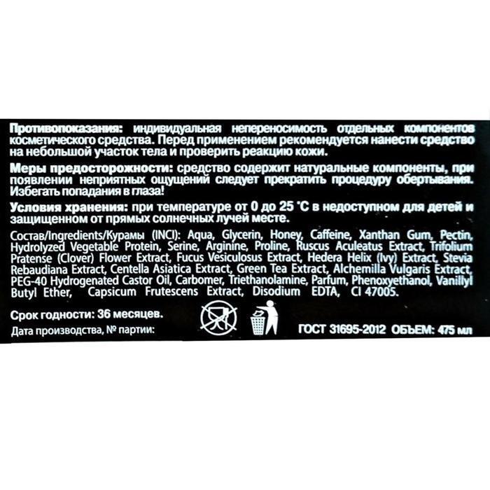 Способ применения: распределите средство обильно по всему телу. Для усиления эффекта оберните необходимые участки стрейч-плёнкой, укройте пледом или термоодеялом. Подождите 20–30 минут. В конце процедуры смойте остатки тёплой водой.