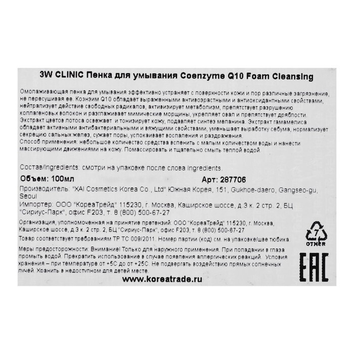 Состав: Water, Stearic Acid, Potassium Hydroxide, Lauric Acid, Cocamidopropyl Betaine, Myristic Acid, Glycerin, Lauramide DEA, Glyceryl Stearate, PEG-100 Stearate, Phenoxyethanol, Ubiquinone, Methylparaben, Propylparaben, Nelumbium Speciosum Flower Extract, Hamamelis Virginiana (Witch Hazel) Extract, Disodium EDTA, Cl 19140, Perfume.