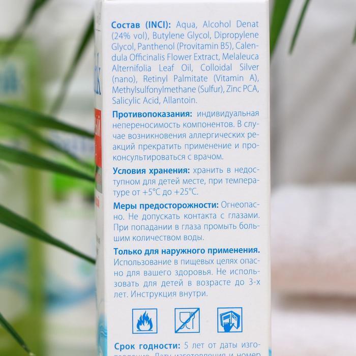 Входящие в состав формулы вспомогательные компоненты закрепляют эффект и ускоряют заживление кожи без рубцов и пятен. Действие лосьона усилено маслом чайного дерева и коллоидным серебром.
