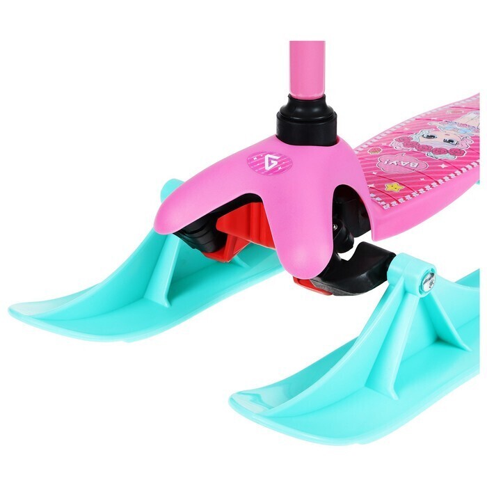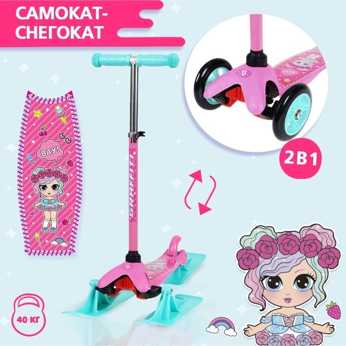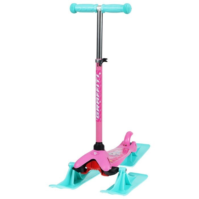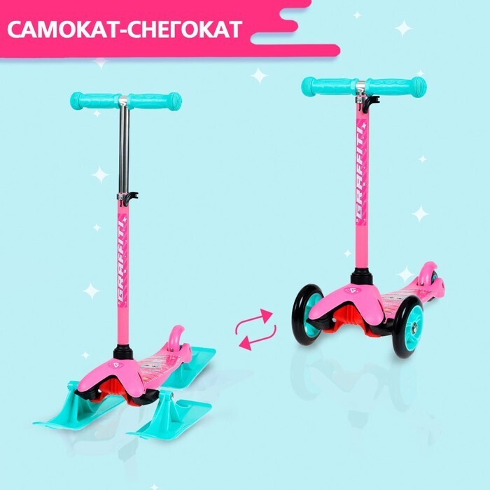 Детский самокат-снегокат — новая модель для летнего и зимнего активного отдыха. Конструкция представляет собой раму самоката, на которую установлены лыжи. Передняя лыжа управляется поворотом руля. Колёса можно установить в любой момент, для этого в комплекте есть всё необходимое.