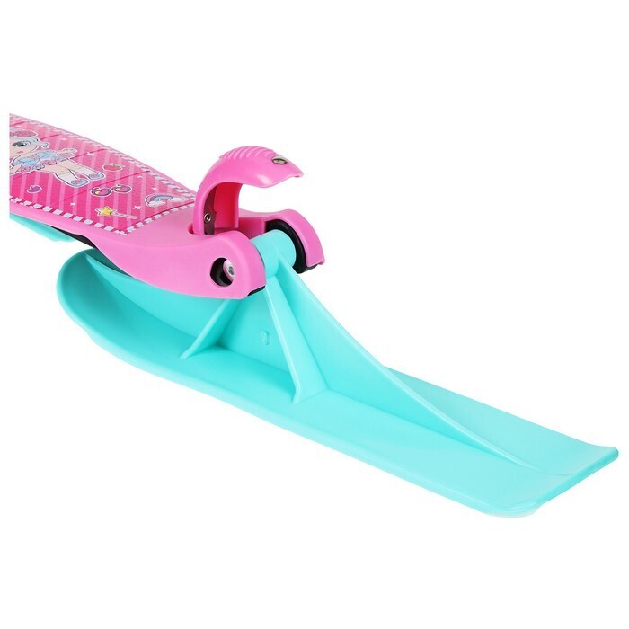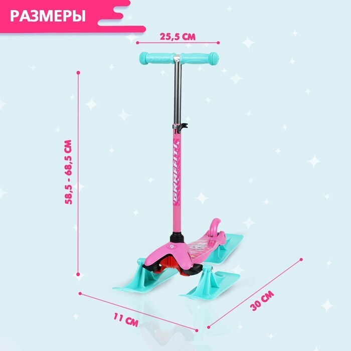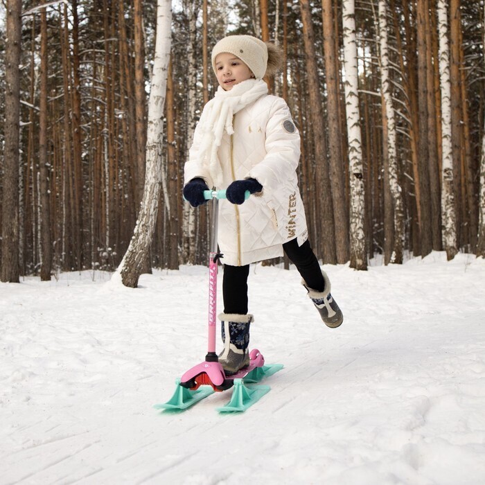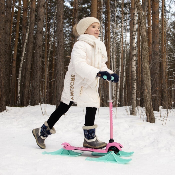 Самокат-снегокат актуален зимой и летом. На колёсах можно кататься по любым ровным поверхностям в сухое время года, зимой — на лыжах по снегу.