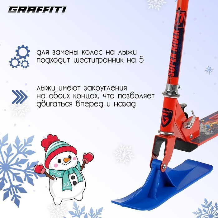 Детский самокат-снегокат — новая модель для летнего и зимнего активного отдыха. Конструкция представляет собой раму самоката, на которую установлены лыжи. Передняя лыжа управляется поворотом руля. Колёса можно установить в любой момент, для этого в комплекте есть всё необходимое.