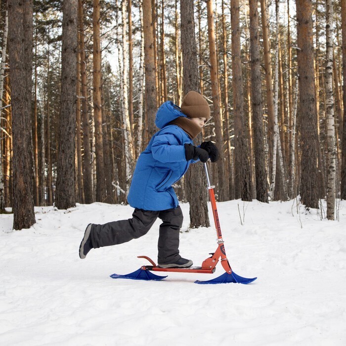 Самокат-снегокат актуален зимой и летом. На колёсах можно кататься по любым ровным поверхностям в сухое время года, зимой — на лыжах по снегу.