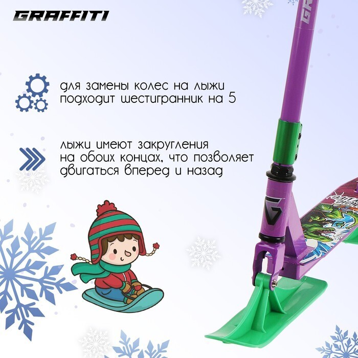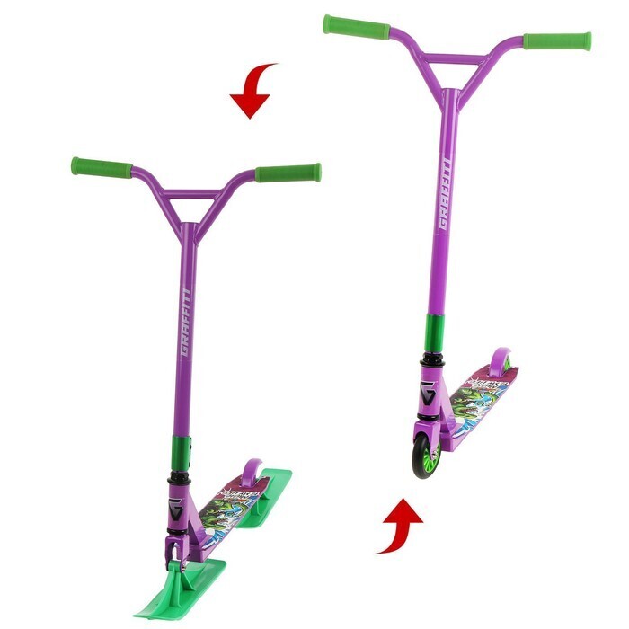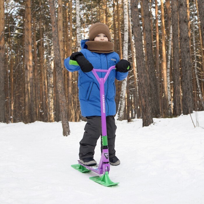 Детский самокат-снегокат — новая модель для летнего и зимнего активного отдыха. Конструкция представляет собой раму самоката, на которую устанавливаются лыжи или колёса. Трюковая рама выдерживает больший вес и более активную езду. Передняя лыжа управляется поворотом руля. Колёса можно установить в любой момент, для этого в комплекте есть всё необходимое.