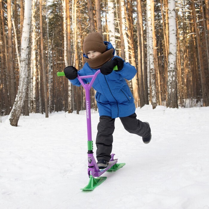 Самокат-снегокат актуален зимой и летом. На колёсах можно кататься по любым ровным поверхностям в сухое время года, зимой — на лыжах по снегу.