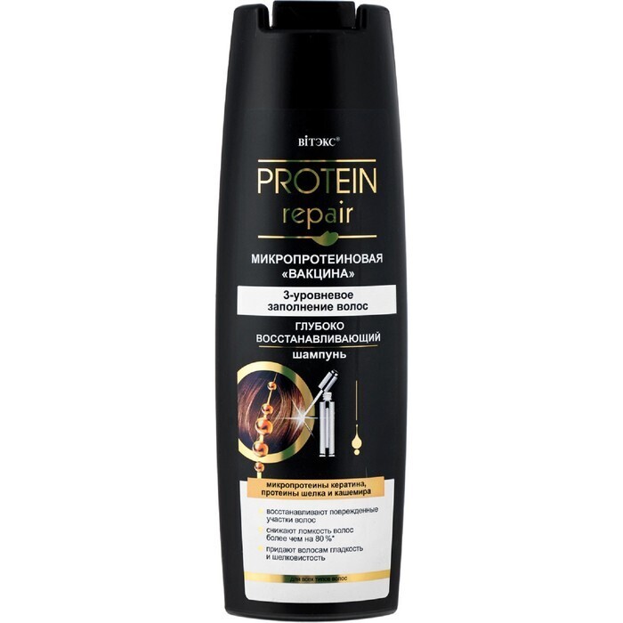 Шампунь прекрасно очищает и интенсивно ухаживает за волосами, глубоко восстанавливая и защищая их от корней до самых кончиков. МИКРОПРОТЕИНОВАЯ «ВАКЦИНА» обеспечивает 3-уровневое заполнение волос, восстанавливая поврежденные участки волос и сокращая их ломкость, более чем на 80%*. В результате действия протеинов волосы наполняются силой и красотой, становятся более сильными и устойчивыми к повреждениям, восстанавливается их упругость, эластичность, волосы обретают сияющий здоровый блеск.
