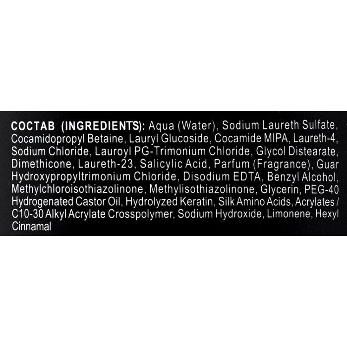 Состав: вода, лауретсульфат натрия, кокамидопропилбетаин, лаурилглюкозид, кокамид MIPA, лаурет-4, хлорид натрия, хлорид лауроил ПГ-тримония, гликольдистеарат, диметикон, лаурет-23, салициловая кислота, парфюмерная композиция, хлорид гидроксипропилтримония гуара, ЭДТА динатрия, бензиловый спирт, метилхлоризотиазолинон, метилизотиазолинон, глицерин, ПЭГ-40 гидрогенизированное касторовое масло, гидролизованный кератин, аминокислоты шелка, кроссполимер акрилатов и C10-30 алкилакрилата, гидроксид натрия, лимонен, гексилциннамаль