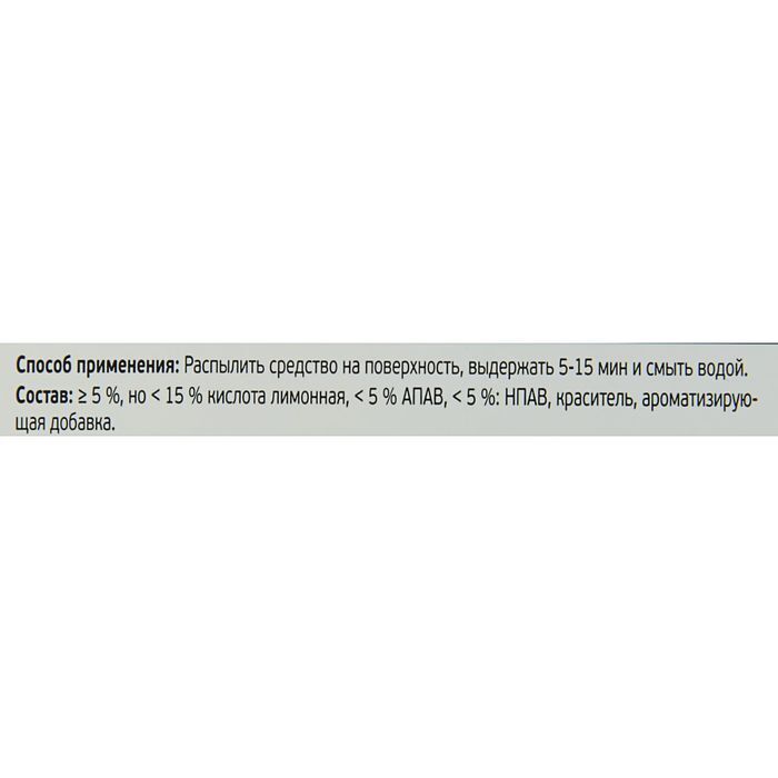 Состав: ≥5%, но <15% кислота лимонная, ≥5%, но <15% молочная кислота, <5% АПАВ, краситель, ароматизирующая добавка.