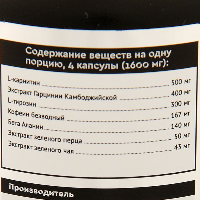 Состав: карнитин, экстракт Гарцинии Камбоджийской, -тирозин, кофеин безводный, бета-аланин, экстракт черного перца, экстракт зеленого чая, желатиновая капсула (желатин).