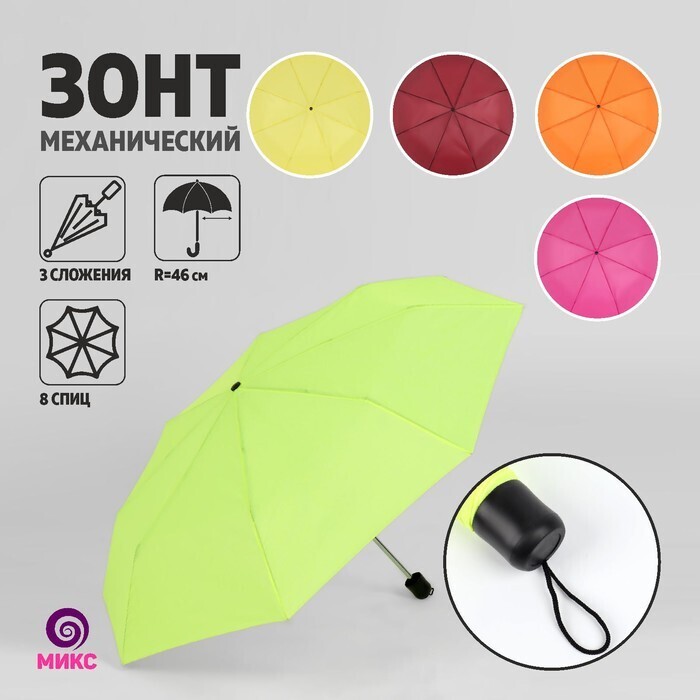 Зонт механический «Однотонный», 3 сложения, 8 спиц, R = 46 см, цвет МИКС