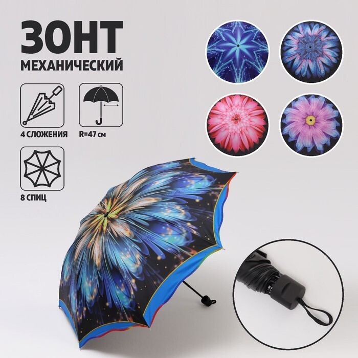 Зонт механический «Цветок», 4 сложения, 8 спиц, R = 47 см, рисунок МИКС